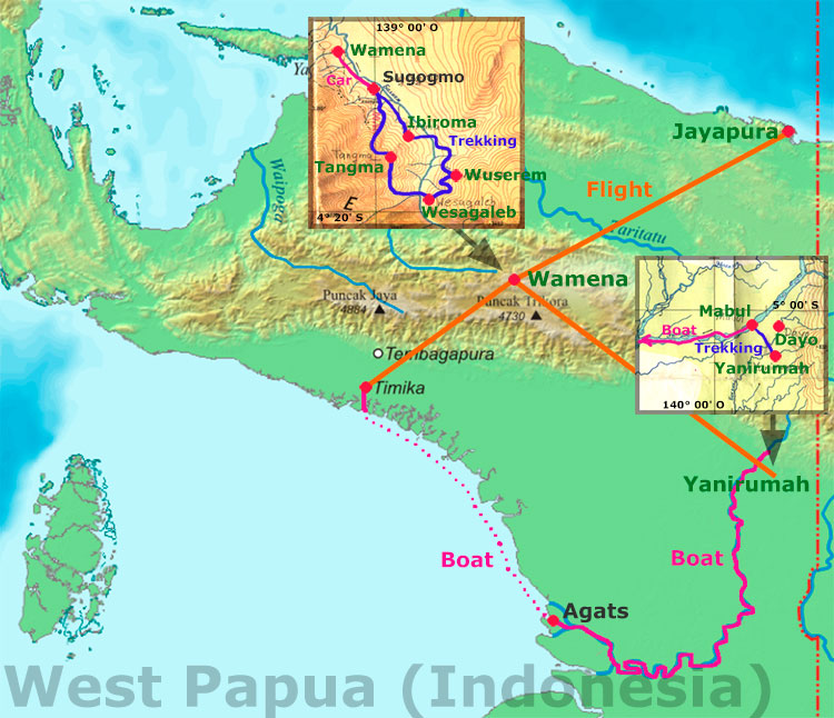 Irian Jaya (West Papua New Guinea) is the Indonesian part of the island New Guinea. Irian Jaya belongs to Indonesia since 1963. Today, there is a fight for independence with little likelihood of success. While the main cities like Jayapura (the province capital), Wamena and Timika are dominated by Indonesians, in the distant areas the native inhabitants live relatively undisturbed. At our visit in the village Suroba near Wamena, we were assimilated as family members into the Dhani tribe.